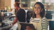 4K-Videomaterial einer jungen Frau, die ein digitales Tablet benutzt, während sie in einem Café arbeitet - 4K Stock-Video