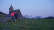 Observe an active mature couple exploring Velika Planina in Slovenia. This video captures them passing by a charming wooden church amidst the mountain pasture. With backpacks and hiking poles, they immerse themselves in the scenic beauty of the Slovenian countryside, enjoying their outdoor adventure together.