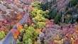 Aerial view moving up canyon looking down at colorful trees flying parallel to winding road.