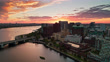 Luftaufnahme von Cambridge, Massachusetts bei Sonnenuntergang, mit Blick über den Charles River entlang der Uferpromenade.