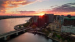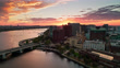Luftaufnahme von Cambridge, Massachusetts bei Sonnenuntergang, als sich der Zug der Longfellow Bridge nähert - 4K Stock-Video