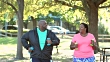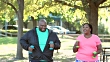 An African-American couple working out together in the park, holding hand weights, walking toward the camera. They both have large builds.