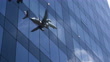 Flugzeug spiegelt sich in der Glasfassade eines großen Geschäftsgebäudes