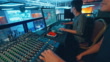 Asiatische Sportevent-Crew arbeitet hinter den Kulissen mit Bedienfeld für Bühnenbeleuchtung, Soundsystem und Lichteffekt
