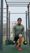 SLO MO Athletic Young Man in Sports Clothing Doing Lunges With Dumbbells at Park in City