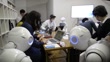 MS attendees work on laptops with humanoid robots named Pepper, developed by SoftBank Corp.'s Aldebaran Robotics unit, stand during a Softbank developer's workshop for students and robot enthusiasts in Tokyo, Japan, on Wednesday, March 4, 2015, Attendee watches humanoid robot Pepper clap its artificial hands