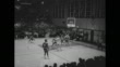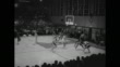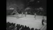 Title: "Basketball - San Francisco Wins 39th in a Row" superimposed over games between the San Francisco Dons and Fresno State College / VS San Francisco's #6 Bill Russell, Center, signing autograph / CU Russell smiling / CU Russell signing autographs / Side view crowd / Back view of Russell going down court with other members of team / San Francisco in possession of ball - player shoots for basket and misses, San Francisco recovers and attempts another - misses, Russell taps ball in for goal / WS crowd applauding / San Francisco in possession - ball is fed to Russell, Russell makes hook shot for goal / WS crowd applauding / Fresno State in possession, player shoots for basket, misses and San Francisco takes possession / Back view San Francisco going down court with ball / ball passed to Russell, he makes lay-up shot for goal / CU scoreboard Visitors 69 - Fresno 50 / players and cheerleaders on field