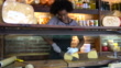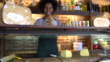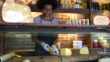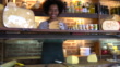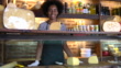 Beautiful black woman working at a deli cutting a piece of cheese and then smiling at camera very cheerfully