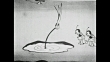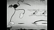 A long legged crane like black bird walks along behind two bugs in the woods / the bird walks into a giant puddle / the bugs turn and laugh.