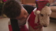CU TD HANDHELD Boy (6-7) embracing Bedlington Terrier wearing Christmas clothing / Dinton, Wiltshire, UK