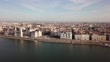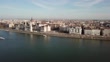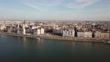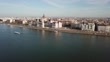 Hungarian Parliament Building. Moving cars. City panorama. View on Danube. Floating boat