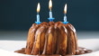 Burning blue birthday candles on marble cake with chocolate nougat icing - panning shot