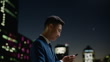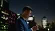 Business man, roof and night for texting, phone and thinking with communication, mobile app or networking on web. Japanese entrepreneur, smartphone and idea for memory, email or social media in Tokyo