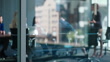 Business people meeting, group teamwork and manager talking, conversation and explain company strategy, planning or ideas. Leadership, window or boardroom team listening to project management report