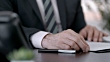 Nahaufnahme eines Geschäftsmannes, der an seinem Schreibtisch im Büro sitzt, ein Dokument zerreißt und in den Müll wirft. Gedreht in Slowenien.