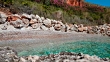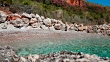 Cala Calampiso liegt zwischen San Vito Lo Capo (Trapani, auf Sizilien) und dem Naturschutzgebiet von Zingaro. Kristallklares Wasser und Natur machen diese Orte zu einer erstaunlichen natürlichen Schönheit. Die Hitze wedelt die Luft.