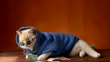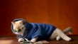 Eine Katze im blauen Kapuzenpulli, Sonnenbrille und einer Goldkette um den Hals liegt neben dem Geld. Er schiebt die Geldscheine mit der Pfote - HD Stock-Video