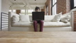Eine zentrierte Aufnahme einer queeren weißen Frau in ihren Zwanzigern, die auf ihrem Schoß inmitten einer cremefarbenen Leinencouch in einem hell erleuchteten Innenraum mit hohen Decken und freiliegenden Ziegeln an ihrem Laptop arbeitet - 4K Stock-Video