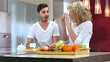 HD1080p: Cheerful young woman pretending to wear glasses while having breakfast with her boyfriend at home.