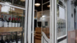 Fröhlicher Mitarbeiter des Feinkostladens mit einer Holzkiste mit Fleisch, Eiern und anderen Produkten für eine Lieferung lächelnd - 4K Stock-Video