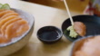 Close Up Hands mit Chopstick Picking Salmon Sashimi Tauchen in Sojabohnen und Wasabi im japanischen Restaurant. - 4K Stock-Video