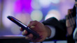 Close-up with focus on the foreground of a distracted person leaning against a fence and closing an application on their phone. They then scroll through the applications on their phone while in the middle of a city.