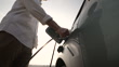 Close up of men hand take a plug in charger insert to the electric car inlet for charge , environment , global warming , electric car , alternative energy , 4K(UHD)