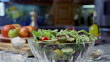 Close up seeds being sprinkled and dressing being poured on salad in glass bowl / tossing salad - HD Stock-Video