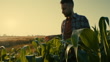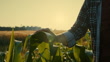 Closeup of male agronomist hand gently touching corn leaves in field during golden sunset. Soft sunlight highlights crop textures as he examines plant health. Peaceful countryside scene symbolizing agriculture, sustainability, and modern farming practices.