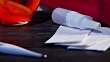 Vitamin pills, cup of tea and thermometer are on the nightstand on the foreground. The bed with woolen scarf on the pillow is on the background
