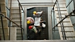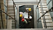 Wide locked down right above shot of three construction workers and female architect with safety helmets talking about the plan they are holding at the bottom of the scaffold stair at the construction site. The workers are pointing out the issue above them on the top floor. Shot in Slovenia.