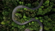 Curved road winds through the dense green forest. Sustainability and e-mobility combined in one image. The motif reflects the desire to travel on a road trip and stands for freedom and travel by an electric car. The electric vehicles drive through the forest and the beautiful nature. Top-Down perspective from a birds eye view captured with the drone.