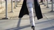 NEW YORK, NEW YORK - FEBRUARY 14: (SLOW-MO) Danielle Bernstein wears black sunglasses, silver earrings, a black oversized long coat, black shiny leather gloves, a black shiny braided leather handbag, a white with black and gray wavy print pattern halter neck asymmetric cropped top, matching white with black and gray wavy print pattern wide legs pants, black shiny leather square toe cap block heels ankle boots, outside the Bevza show , during New York Fashion Week, on February 14, 2022 in New York City. (Footage by Edward Berthelot/Getty Images)