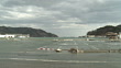 Destruction in Onagawa city, near Sendai Japan on 3rd April 2011; after tsunami following Tohuku earthquake of March 2011. Tidal flooding in Onagwa port due to coastal area sinking after earthquake - HD Stock-Video
