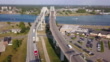 Drohnen-Clip mit Blick auf eine lange Reihe von Semis, die den kanadischen Grenzübergang sehen - 4K Stock-Video