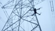 Low angle shot of drone hovering near electricity pylon under blue sky. Its rotors spinning as it maintains precise position. Drone positioned close to structure, likely conducting inspection or monitoring. Bright sky offering clear background while it operates with stability.