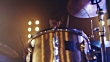 Drummer performing with his instrument on concert stage.