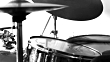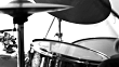 Close up of drummer while hitting snare drum with brushes during an improvisation workshop performance in a studio..