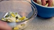Hier sind verschiedene Phasen der Zubereitung von Eiern zur Herstellung von Salat dargestellt. Die Eier werden hier in einer Schüssel zerlegt gezeigt