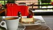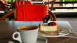 Enjoy a tranquil moment at a cozy cafe with coffee and cheesecake, surrounded by a relaxing ambiance and a delicious sweet treat - 4K Stock-Video