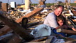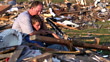 Ein Vater hält seinen Sohn, während er die Zerstörung um sich herum durch eine Naturkatastrophe in Kauf nimmt, die seine Stadt zerstört hat.