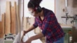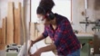 Weite Dolly-Aufnahme einer jungen Tischlerin, die Holz auf der Tischsäge schneidet, in ihrer Werkstatt mit Schutzausrüstung. Gedreht in Slowenien.