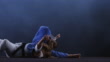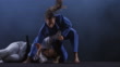 Zeitlupen-Weitwinkelaufnahme einer Judoka-Hündin im blauen Outfit, die ihre Gegnerin in Weiß packt und auf den Boden wirft. Aufgenommen auf schwarzem Hintergrund. Gedreht in Slowenien.