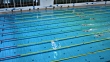 Wide handheld shot of female swimmers' race to the finish in freestyle swimming competition. The competition was created and specially organised just for the shooting. It is not a shot from the official event.