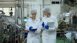 Two female workers discuss the readiness to operate an automatic bottling machine in a beverage factory. Group of scientists using tablets to work Check the conveyor belt production system.
