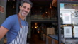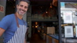 Freundlicher Manager eines Restaurants, das die Tür öffnet und die lächelnde Kamera mit Kundenkontakt begrüßt - Lebensmittel- und Getränkeindustrie