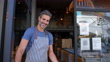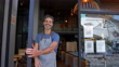 Freundlicher Manager eines Restaurants, das die Tür öffnet und den Kunden mit Blick auf die Kamera lächelnd begrüßt - 4K Stock-Video