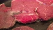 Close up of frying large slices of rump steak in a frying pan.