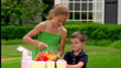 Ein Mädchen schenkt ihrem Bruder ein Glas Saft ein. - HD Stock-Video