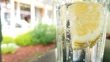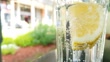 Macro shot of a glass of sparkling soda water with slices of lemon.